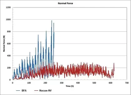 BFA などの汎用砥粒は切れ味が鈍くなるため、作業者や機械は生産性を維持するために大きな力を加える必要がある場合があり、結果ワークピースの焼けや加工不良が発生することがあります。Norzon NV は製品寿命全体を通じて低荷重で安定した切削性能を維持するため、同じ作業をより少ない力と電力で達成でき、研削効率と工具寿命の両方を向上させることが可能です。